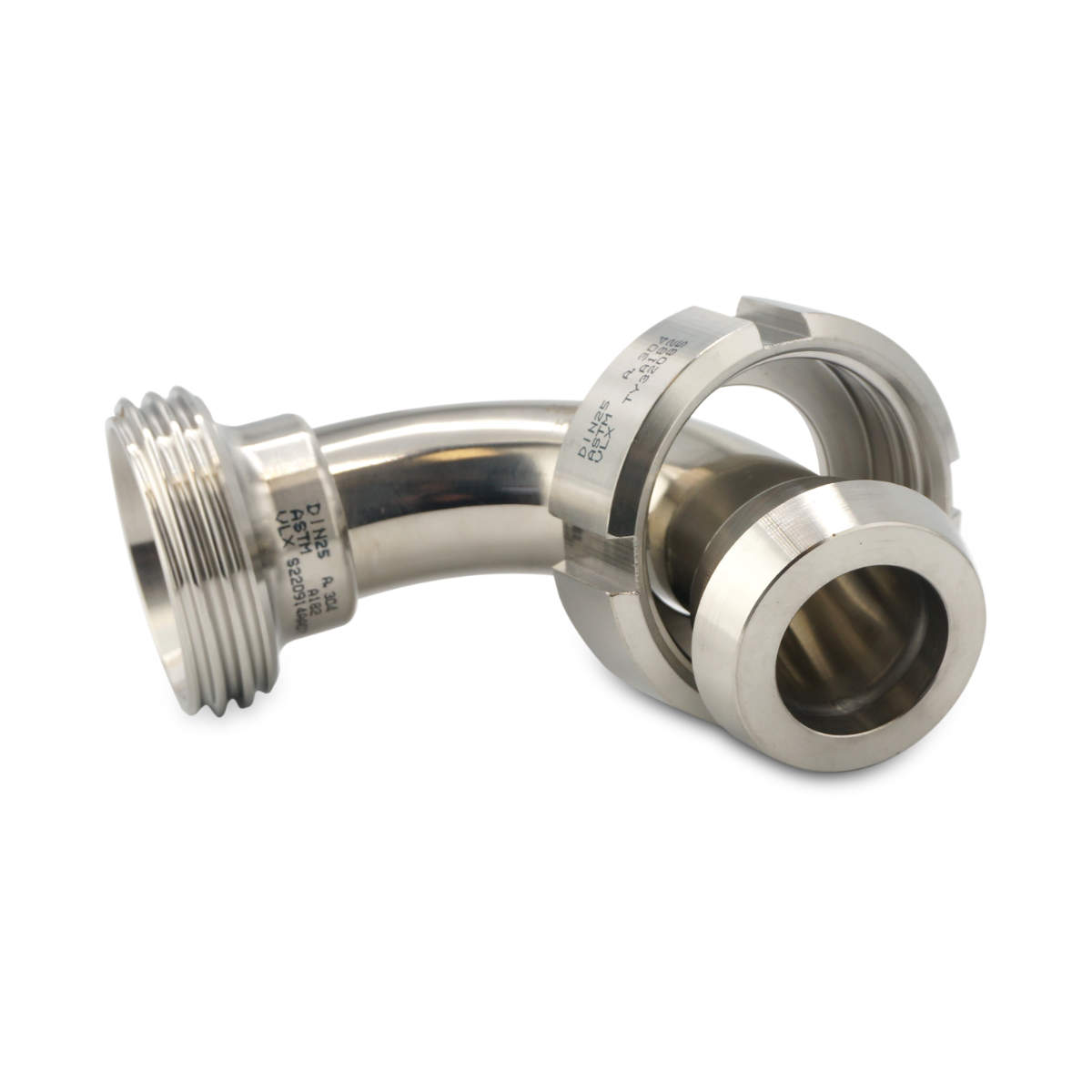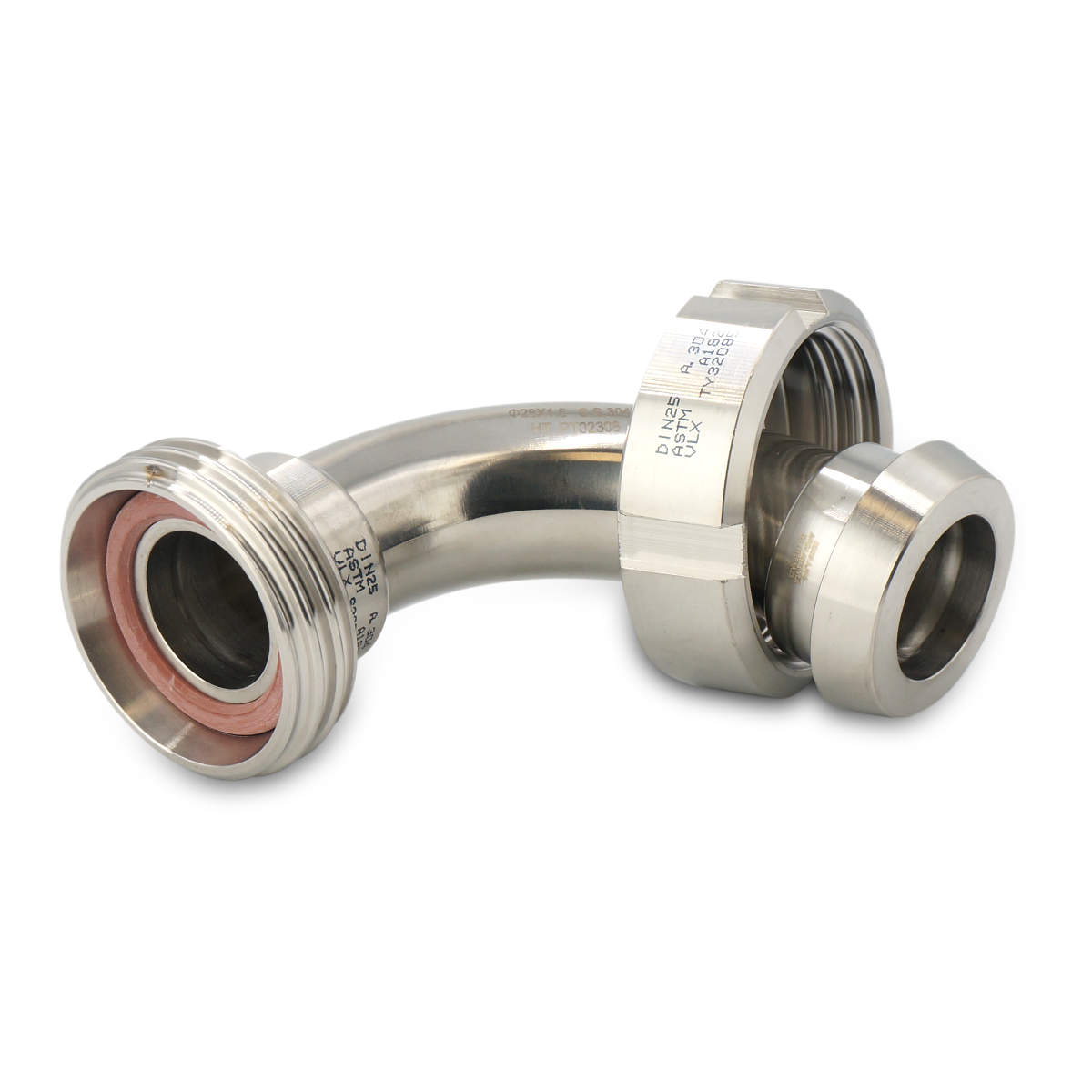 Przedmiotem oferty jest kolano pasujące do złącz zgodnych ze standardem DIN 11851 o średnicy znamionowej 25 mm. Z jednej strony zakończone jest końcówką gwintowaną (uszczelka w zestawie), a z drugiej stożkową z nakrętką. Kąt pomiędzy osiami końcówek wynosi 90 stopni.
