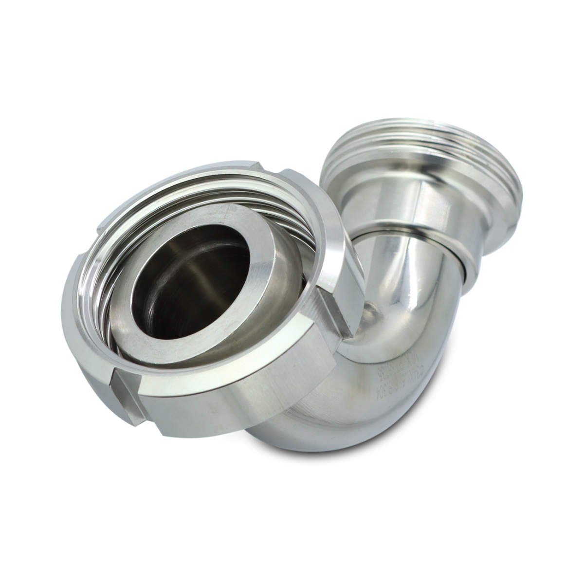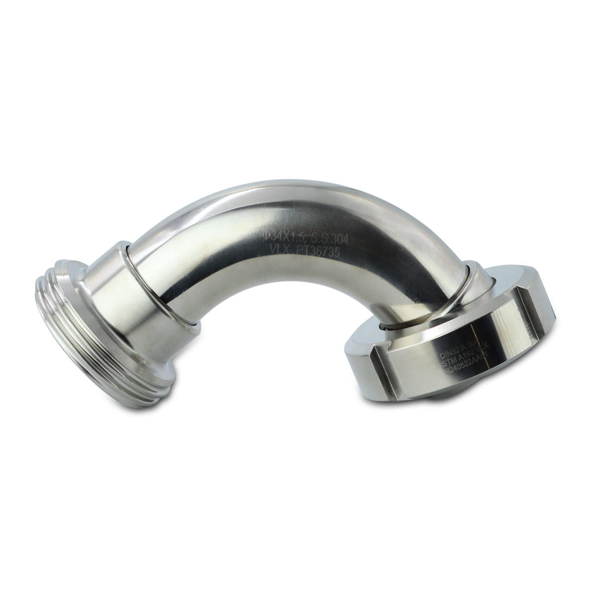 Przedmiotem oferty jest kolano pasujące do złącz zgodnych ze standardem DIN 11851 o średnicy znamionowej 32 mm. Z jednej strony zakończone jest końcówką gwintowaną (uszczelka w zestawie), a z drugiej stożkową z nakrętką. Kąt pomiędzy osiami końcówek wynosi 90 stopni.