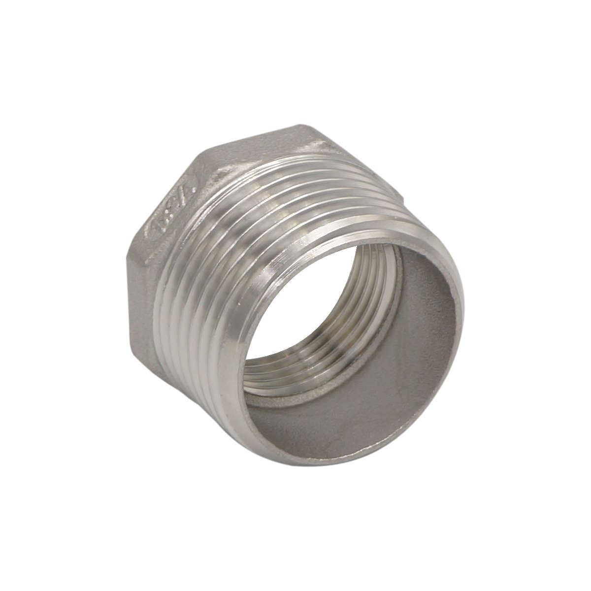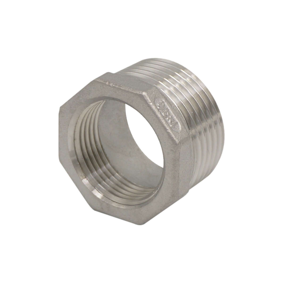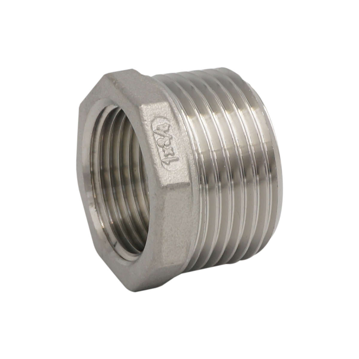 Redukcja posiada gwint zewnętrzny o długości około 15 mm i rozmiarze 1″ oraz gwint wewnętrzny o długości około 10 mm i rozmiarze 3/4″. Wykończenie powierzchni: surowe.