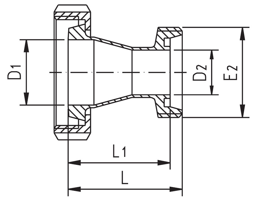 Redukcja składa się z dwóch części: korpusu oraz nakrętki. Taka konstrukcja pozwala na odkręcenie redukcji po stronie nakrętki bez konieczności wcześniejszego odkręcenia jej z drugiej strony. Do prawidłowego montażu konieczna jest uszczelka DN80 Standard: DIN11851 – złącze higieniczne Średnica nominalna 1: DN100 – gwint wewnętrzny (stożek + nakrętka) Średnica nominalna 2: DN80 – gwint zewnętrzny Gatunek stali: 1.4307 (AISI 304L) Średnica wewnętrzna 1: D1 = 100 mm Średnica wewnętrzna 2: D2 = 81 mm Długość: L = 123 mm Długość: L1 = 115 mm Gwint wewnętrzny (w nakrętce): Rd 130 x 1/4″ Gwint zewnętrzny: E2 = Rd 110 x 1/4″ Stal nierdzewna z gatunku 1.4307 charakteryzuje się dużą odpornością na ogólną korozję, przez co doskonale nadaje się do stosowania przy produktach spożywczych i alkoholach. Do pracy przy agresywnych środkach chemicznych zalecamy wybór stali kwasoodpornej z gatunku 1.4404 (AISI 316L).