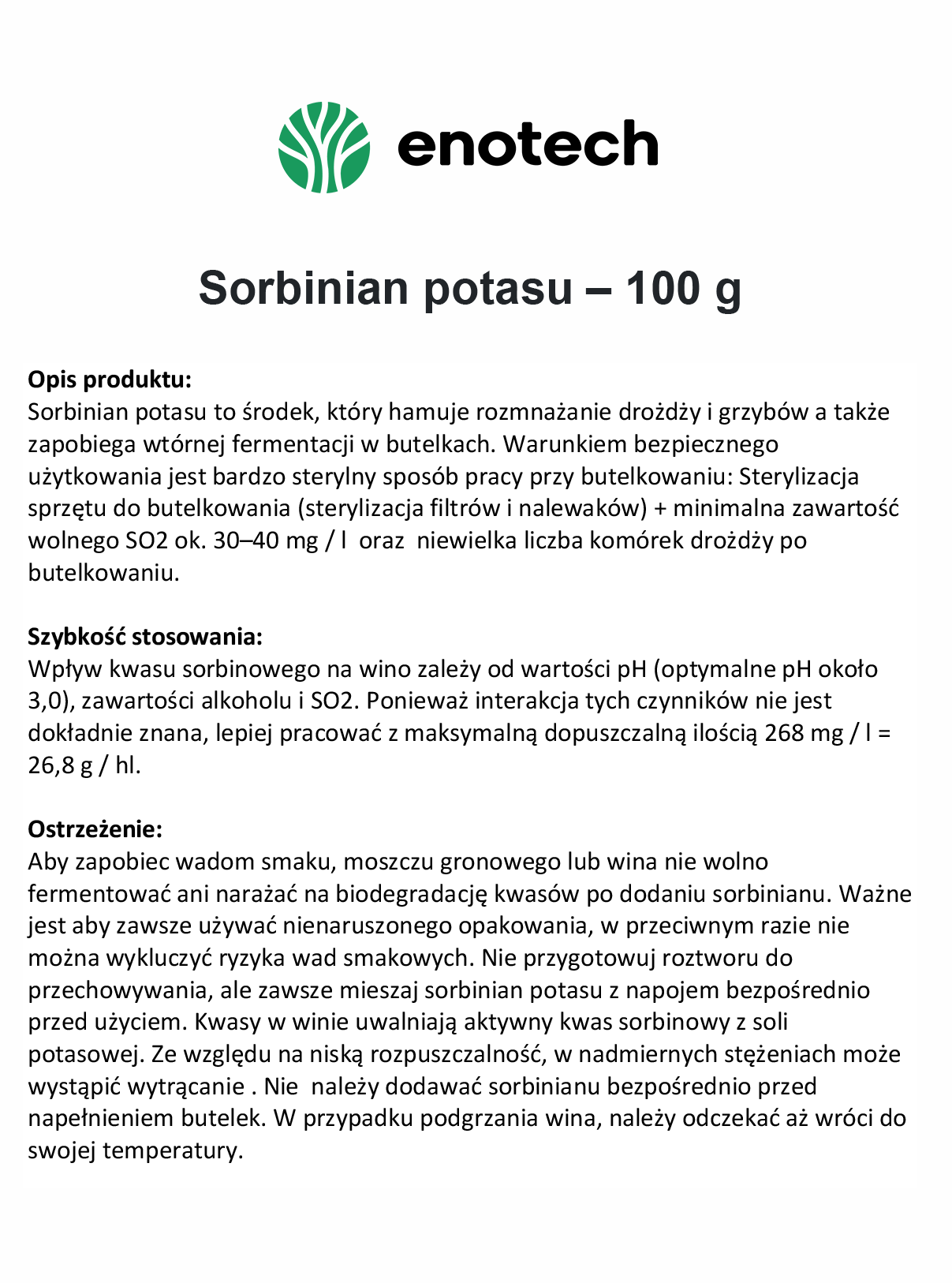 Dla pełnej skuteczności sorbinian potasu powinien być stosowany w połączeniu z odpowiednim poziomem wolnego SO₂ oraz przy zachowaniu wysokiej higieny sprzętu rozlewniczego.