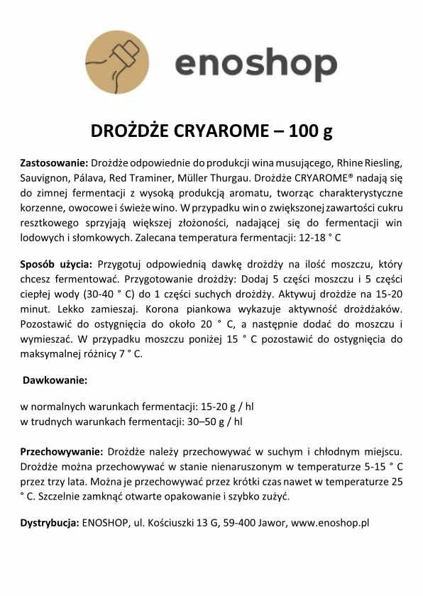 Drożdże Cryarome to specjalnie wyselekcjonowany szczep Saccharomyces cerevisiae, stworzony z myślą o fermentacji w niższych temperaturach i uzyskaniu wyjątkowo świeżych, owocowych aromatów. Doskonale sprawdzają się zarówno w winach białych, jak i czerwonych, a szczególnie w winach słodkich, gdzie nadają elegancję, złożoność i pełnię smaku. Dzięki powolnej ale stabilnej fermentacji Cryarome pozwalają uzyskać czysty profil, z wyraźnymi nutami owoców i świeżości, bez niepożądanych posmaków.