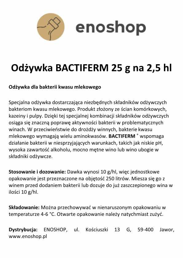 BACTIFERM to specjalistyczna pożywka dla bakterii kwasu mlekowego, opracowana z myślą o bezpiecznym i skutecznym prowadzeniu fermentacji jabłkowo-mlekowej (FJM). Jej skład opiera się na preparacie ze ścian komórkowych drożdży (bez dodatku kazeinianów), wzbogaconym o naturalne aminokwasy, witaminy i minerały. Dzięki temu bakterie fermentacji jabłkowo-mlekowej otrzymują pełny zestaw niezbędnych składników odżywczych, co pozwala im działać nawet w trudnych warunkach – przy niskim pH, wysokim alkoholu czy ograniczonej zawartości składników odżywczych w winie. BACTIFERM przyspiesza i stabilizuje przebieg fermentacji jabłkowo-mlekowej, minimalizuje ryzyko zatrzymań oraz ogranicza rozwój niepożądanych mikroorganizmów. Dodatkowo poprawia profil sensoryczny wina – wina zyskują na łagodności, pełni smaku i harmonii.