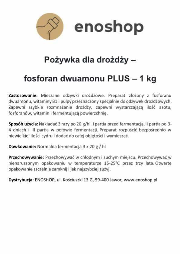Gärsalz Plus to wysokiej jakości, kombinowana pożywka dla drożdży winnych, zawierająca fosforan dwuamonowy (DAP), witaminę B1 oraz celulozę. Taka formuła dostarcza drożdżom nie tylko łatwo przyswajalnego azotu i fosforu, ale także witamin i powierzchni do namnażania komórek. Dzięki temu fermentacja przebiega pewnie nawet w trudnych warunkach, a ryzyko zatrzymania procesu zostaje zminimalizowane. Zastosowanie Gärsalz Plus pozwala na uzyskanie pełnego odfermentowania, czystego aromatu oraz wyższego uzysku alkoholu.