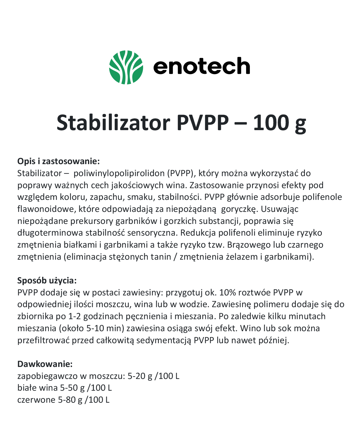 PVPP to wysokiej czystości preparat enologiczny stosowany do usuwania nadmiaru polifenoli odpowiedzialnych za gorycz, cierpkość oraz przedwczesne starzenie się wina. Działa poprzez selektywną adsorpcję związków fenolowych, które mogą powodować ściemnienie barwy i utratę świeżości aromatycznej.