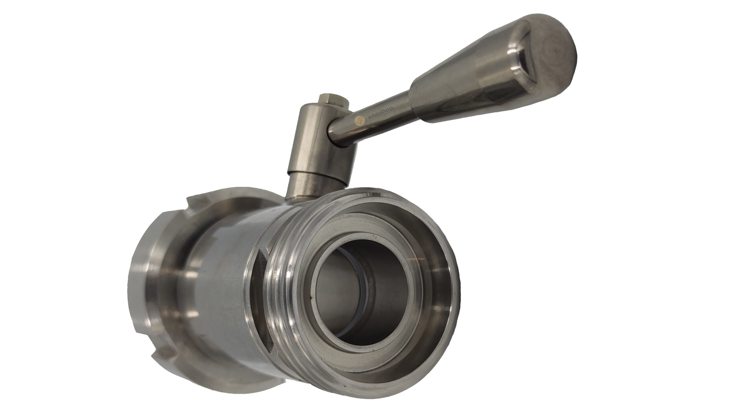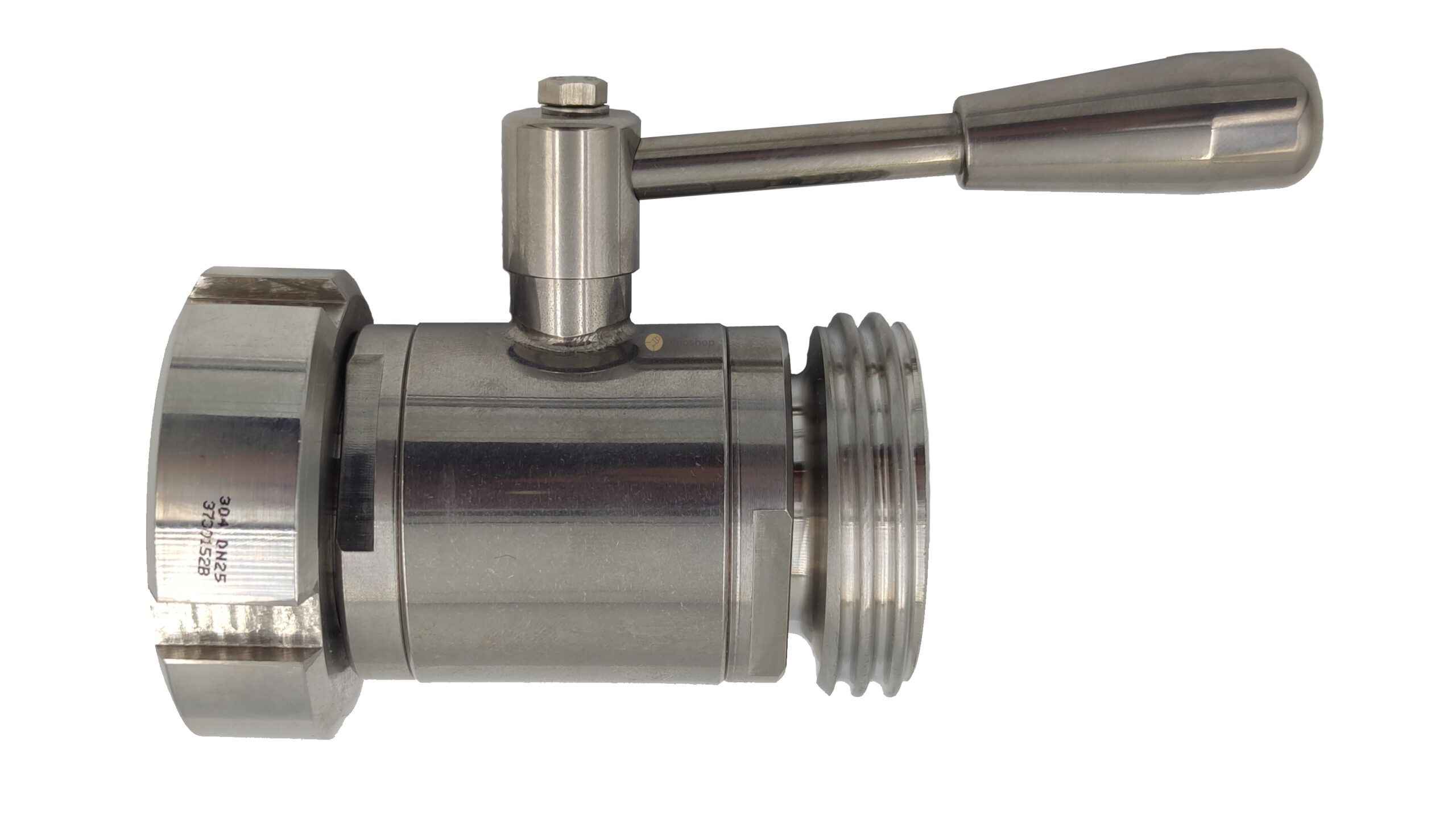 Oferowany zawór z przyłączami w standardzie DIN11851 został w całości wykonany ze stali nierdzewnej AISI304. Kąt obrotu rączki to 180°, dzięki czemu zawór ma dwie pozycje zamknięte i jedną otwartą (w stronę gwintu zewnętrznego).